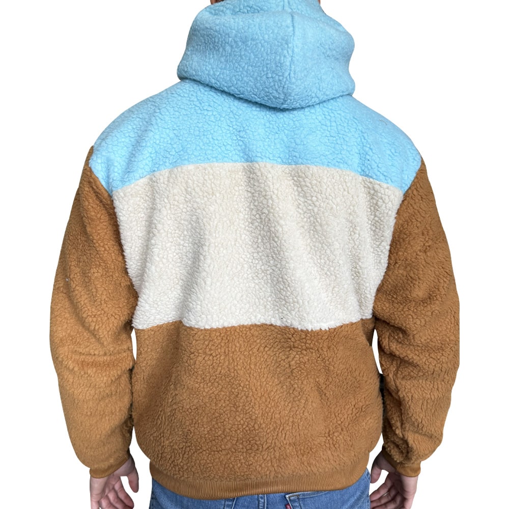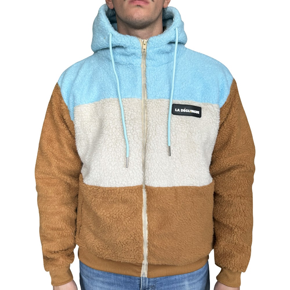 La veste Sherpa tout doux et ses teintes bleu ciel, beige et marron en font une alliée aussi chaleureuse qu’élégante. Sur le cœur, un patch PVC siglé La Déglingue rappelle à tous que tu portes haut les couleurs de la fête. Avec capuche, poches zippées intérieures et extérieures, elle a tout pour tenir chaud à ton corps… et à ton âme de déglingué.