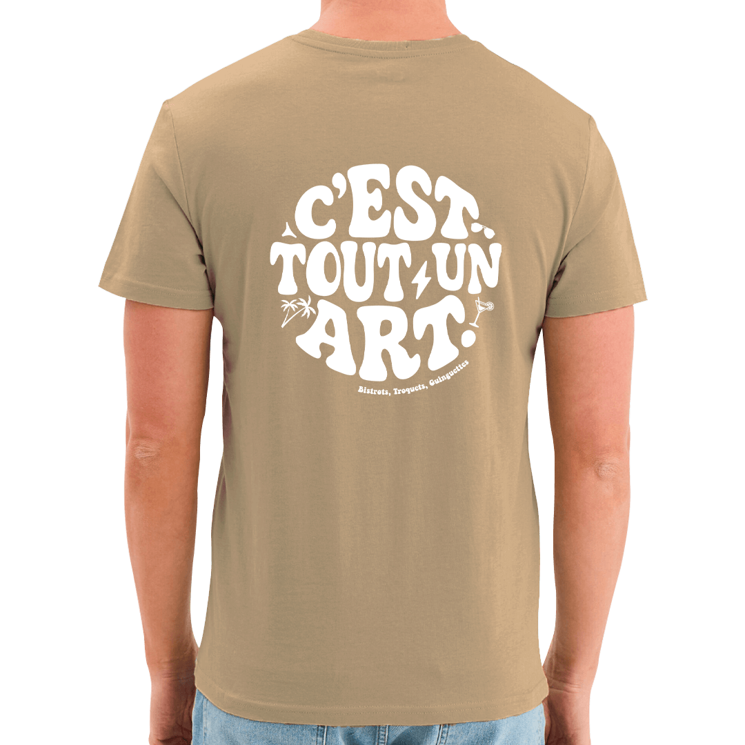 - Design dos : Devise « C’est tout un art. » entourée d’un cocktail, d’un palmier et des mots-clés troquets, bistrot, guinguette. Une fresque estivale pour ceux qui savent.