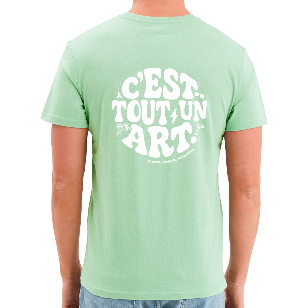 - Design dos : Devise « C’est tout un art. » entourée d’un cocktail, d’un palmier et des mots-clés troquets, bistrot, guinguette. Une fresque estivale pour ceux qui savent.