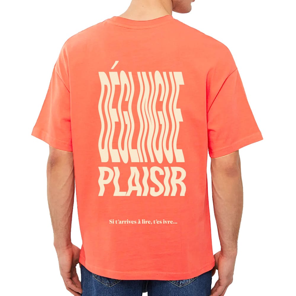 Avec « Le Spritz », La Déglingue t’offre un shot de fraîcheur à porter sur les épaules. Ce t-shirt corail oversize est l’apéro à lui tout seul : un appel à la bringue dès qu’on lit « Soif. » sur ton torse, et un avertissement clair dans le dos pour ceux qui tentent de te déchiffrer : « Si tu arrives à lire, t’es ivre. » Un mélange explosif de déglingue, plaisir, et second degré. À porter sans modération (sauf si tu passes un entretien d’embauche). 🇮🇹